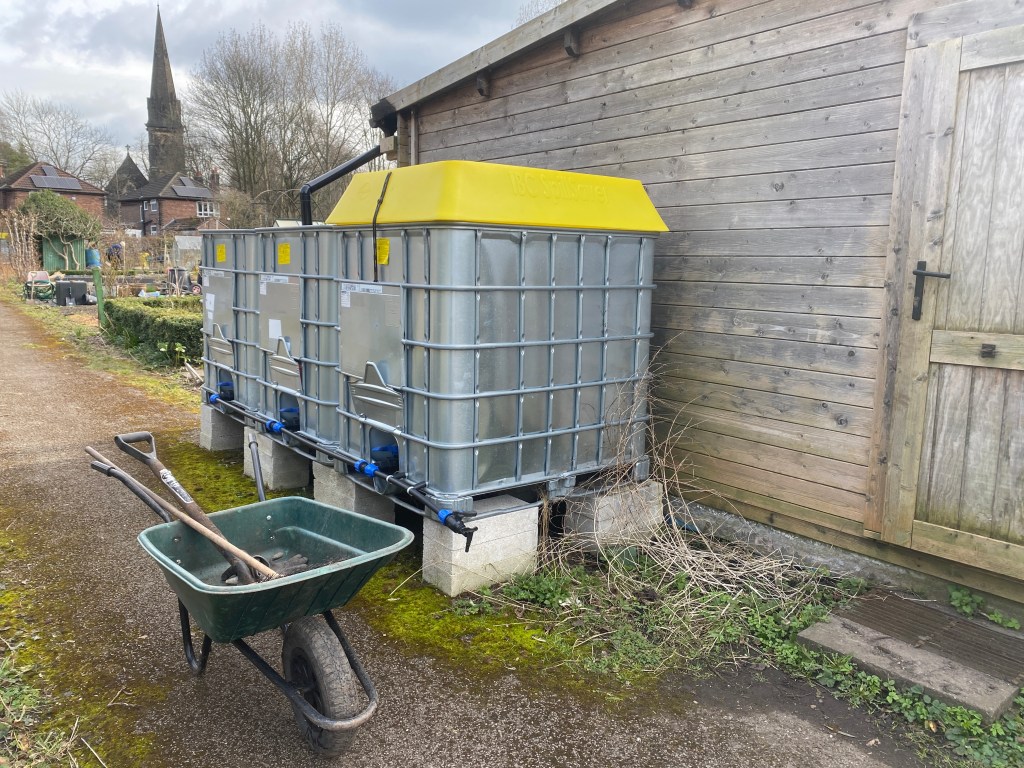 With the bee in my bonnet and the bit between my teeth, I decided to go to the top. A letter to United Utilities’ CEO had a response within 24 hours saying ‘can we visit’? We soon had one of their teams on the allotments mapping our rain water collection facilities, plotting our water butt positions, checking the greenhouses and sheds for suitable downpipes and guttering and working out space for the planned IBCs (individual bulk containers).