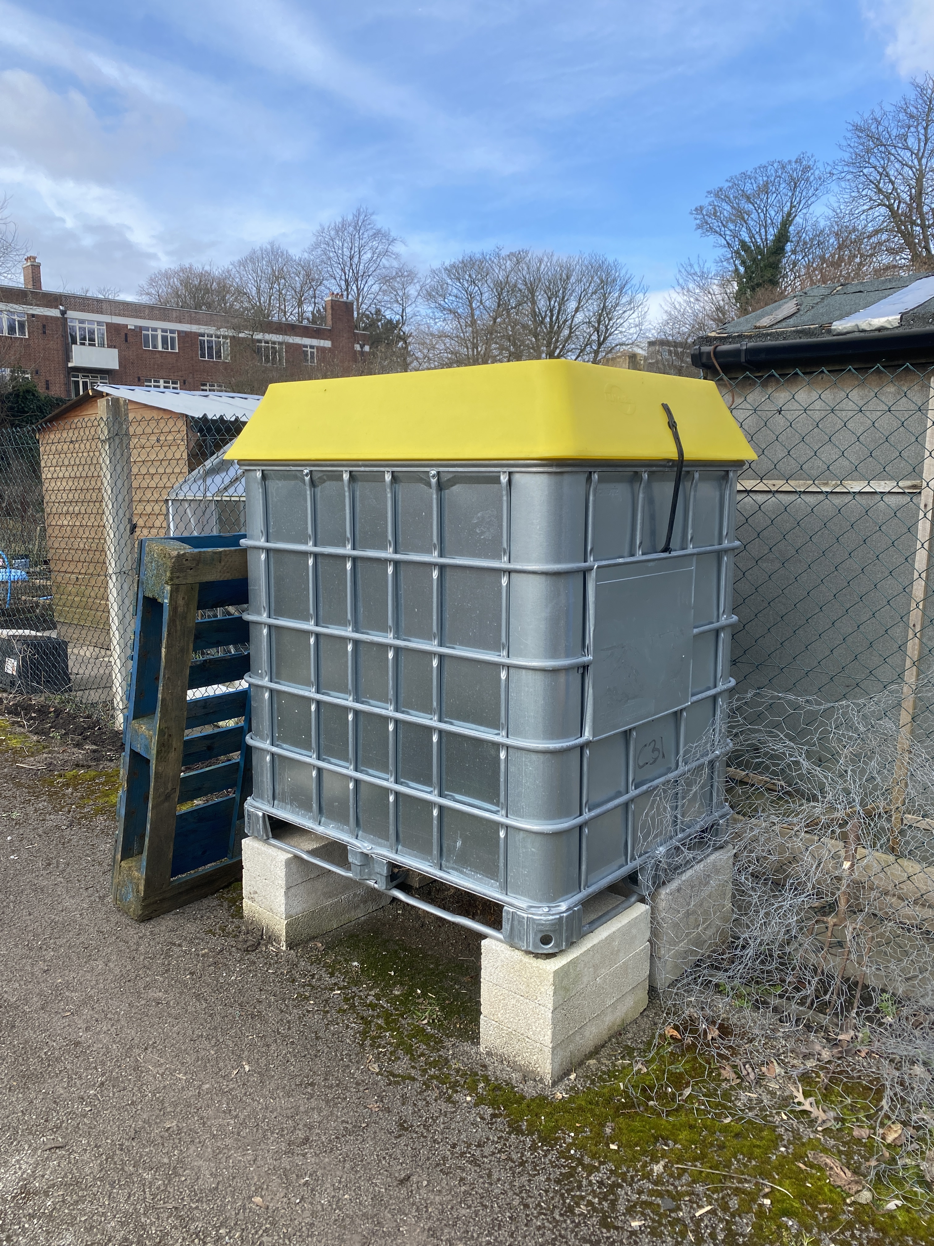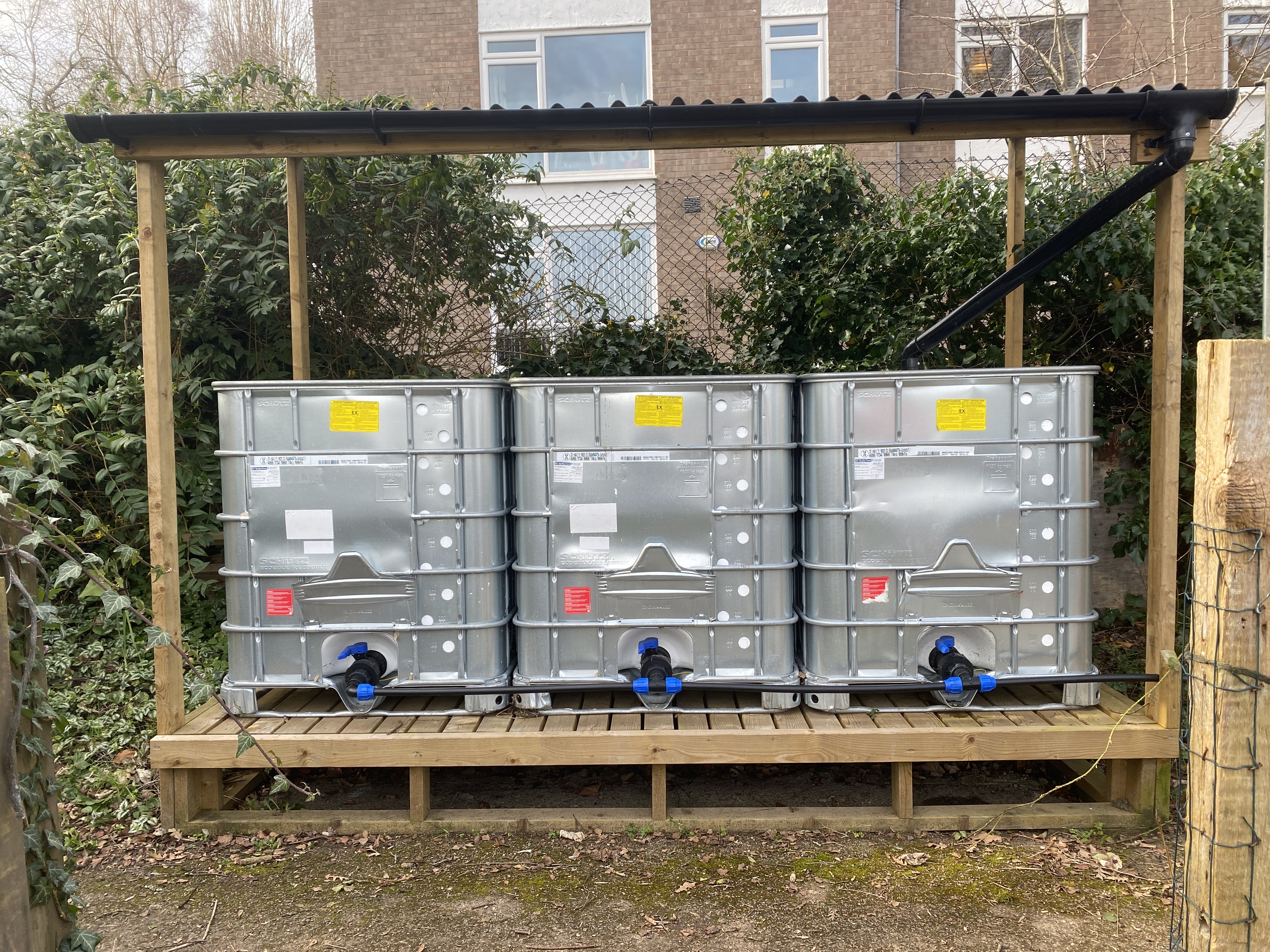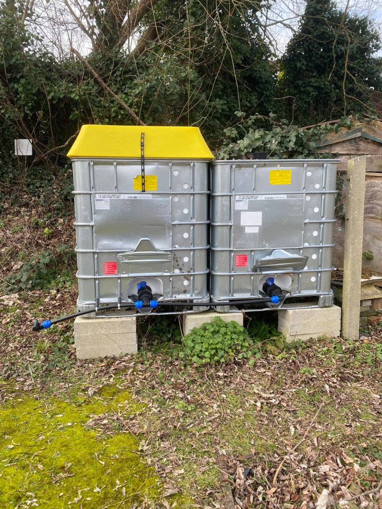 The result is magnificent. Our allotments now have 23 1000 litre IBCs across the whole site. Half of these are filled from rain off roofs via guttering and half have free-standing bright yellow funnels to catch the rain